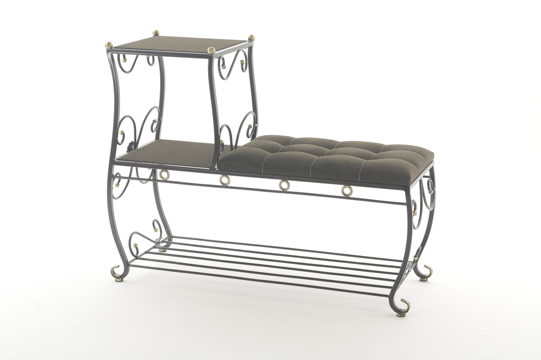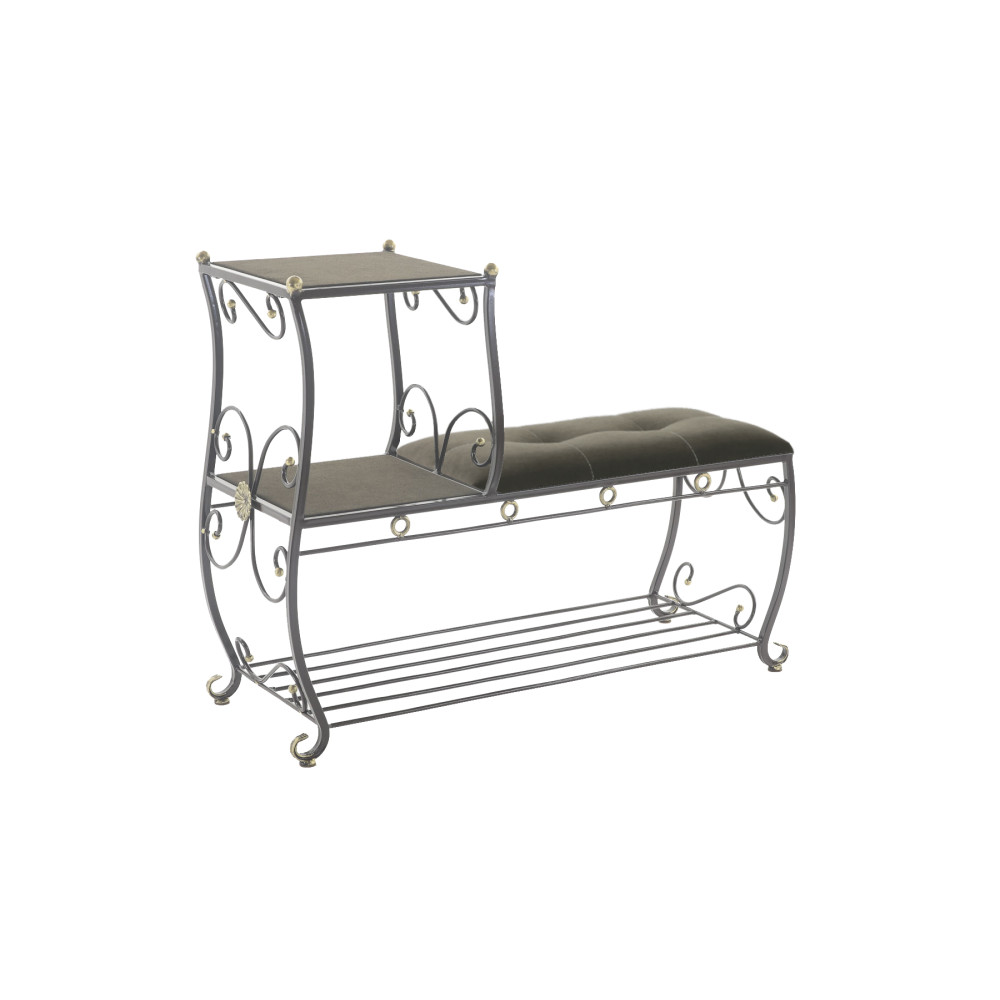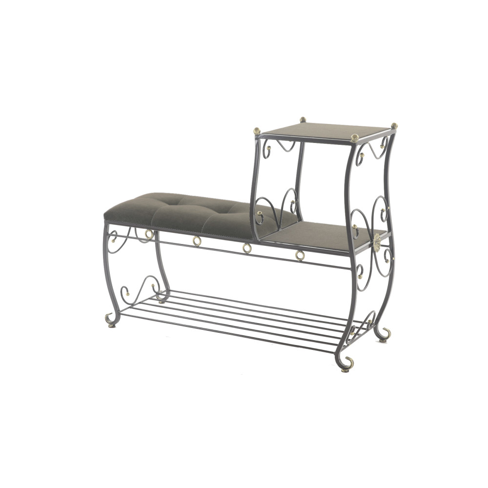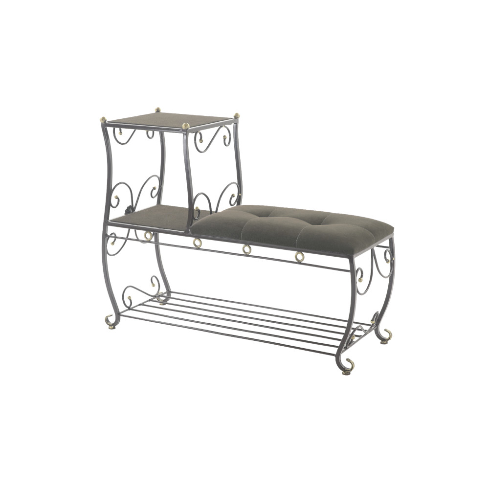 Этажерка представляет собой прочный металлический каркас с мягким сидением из ткани (велюр), а также полочками с открытым доступом к мелким нужным вещам, которые всегда будут под рукой. Кроме того, этажерка комплектуется дополнительной полкой, что мгновенно решит проблему разбросанной обуви. строчка пуфика выполнена высокопрочной полиэфирной нитью, что придает изделию не только красоту, но и надежность, поскольку данная нить устойчива к истиранию и обладает отличной светостойкостью.