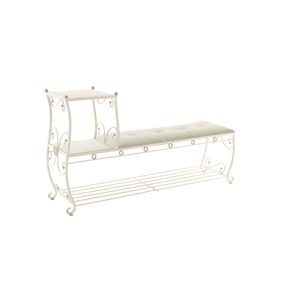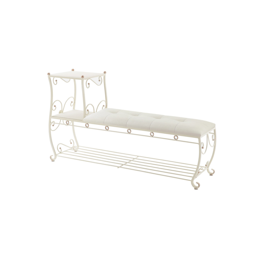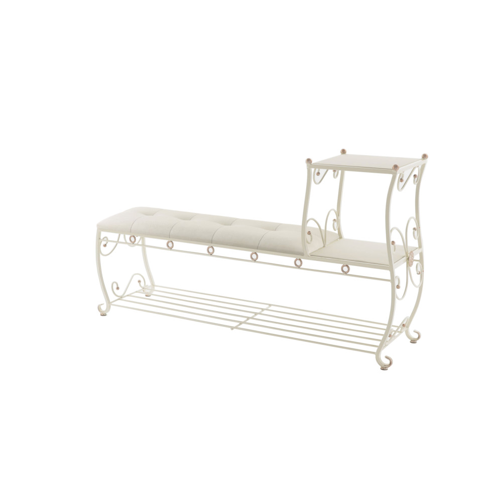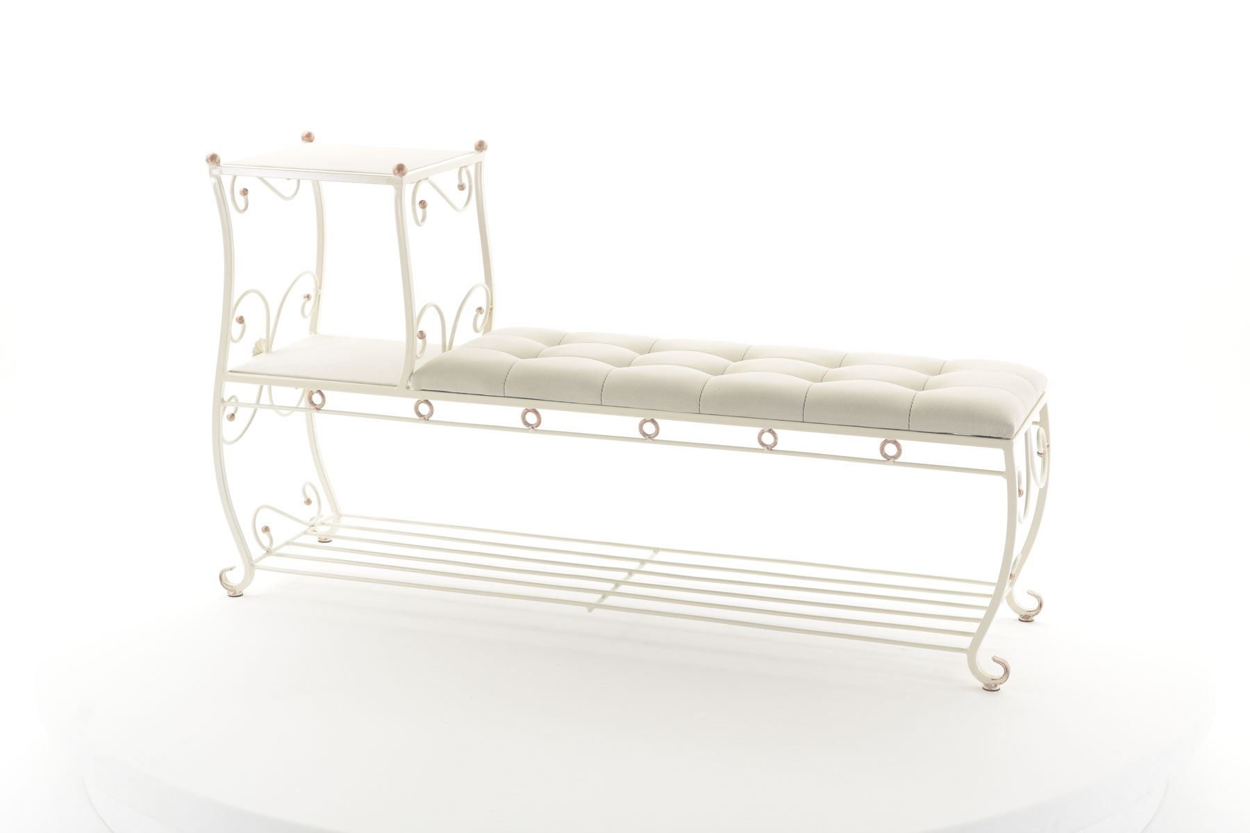Этажерка представляет собой прочный металлический каркас с мягким сидением из ткани (велюр), а также полочками с открытым доступом к мелким нужным вещам, которые всегда будут под рукой. Кроме того, этажерка комплектуется дополнительной полкой, что мгновенно решит проблему разбросанной обуви. строчка пуфика выполнена высокопрочной полиэфирной нитью, что придает изделию не только красоту, но и надежность, поскольку данная нить устойчива к истиранию и обладает отличной светостойкостью.