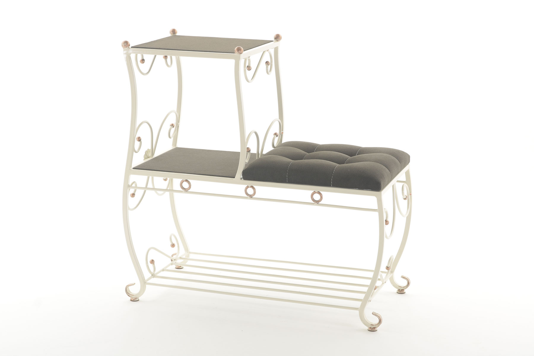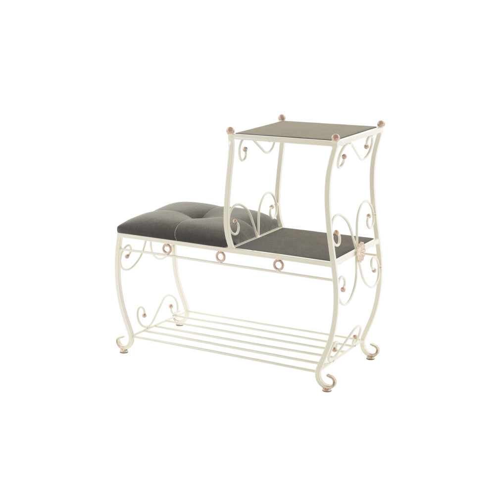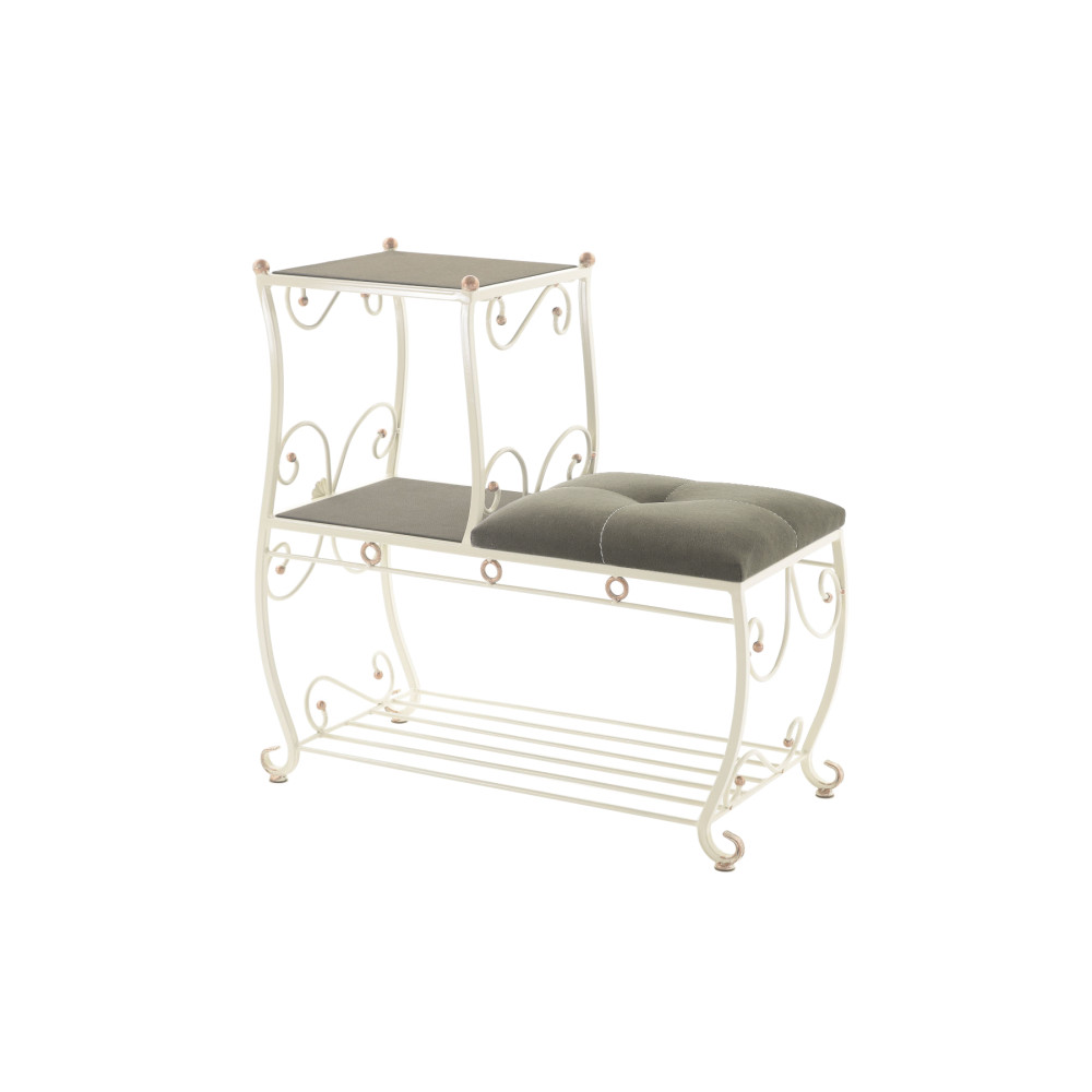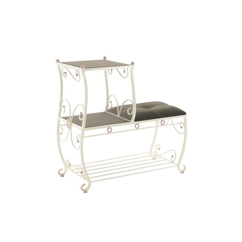 Этажерка представляет собой прочный металлический каркас с мягким сидением из ткани (велюр), а также полочками с открытым доступом к мелким нужным вещам, которые всегда будут под рукой. Кроме того, этажерка комплектуется дополнительной полкой, что мгновенно решит проблему разбросанной обуви. строчка пуфика выполнена высокопрочной полиэфирной нитью, что придает изделию не только красоту, но и надежность, поскольку данная нить устойчива к истиранию и обладает отличной светостойкостью.