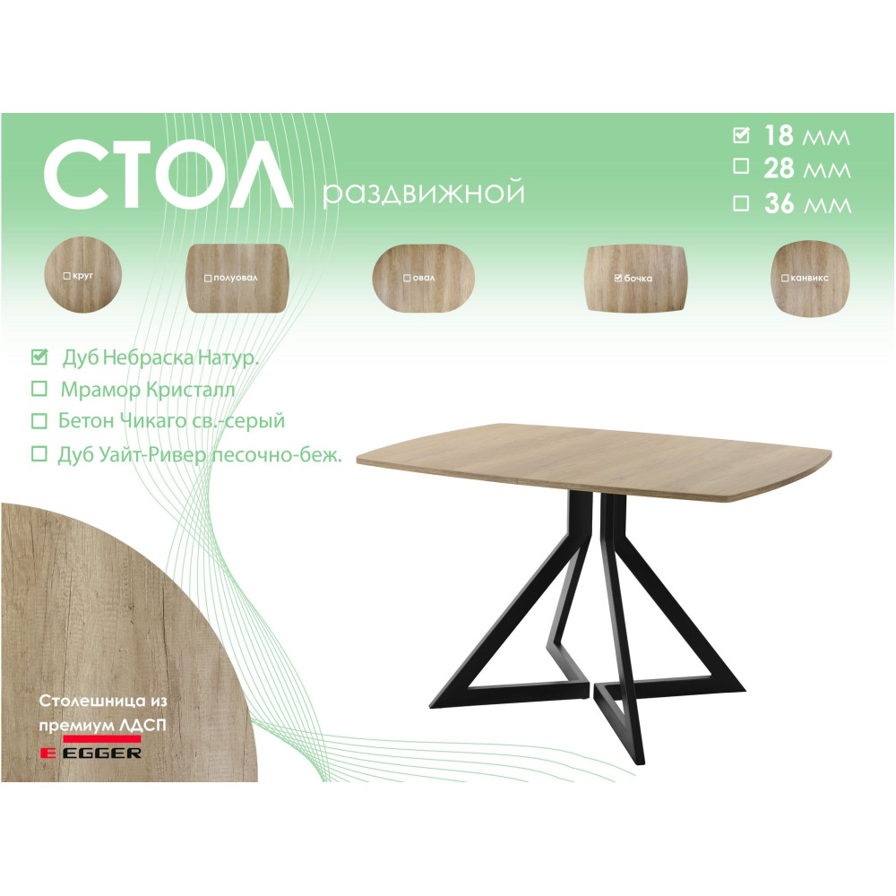 Тип столаобеденный стол | Форма поставкив разобранном виде | Форма столешницыбочка |