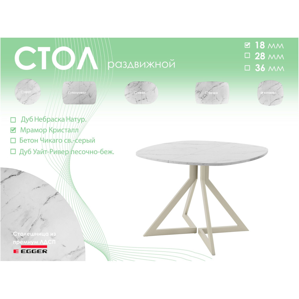 | Тип столаобеденный стол | Форма поставкив разобранном виде | Форма столешницыканвикс |