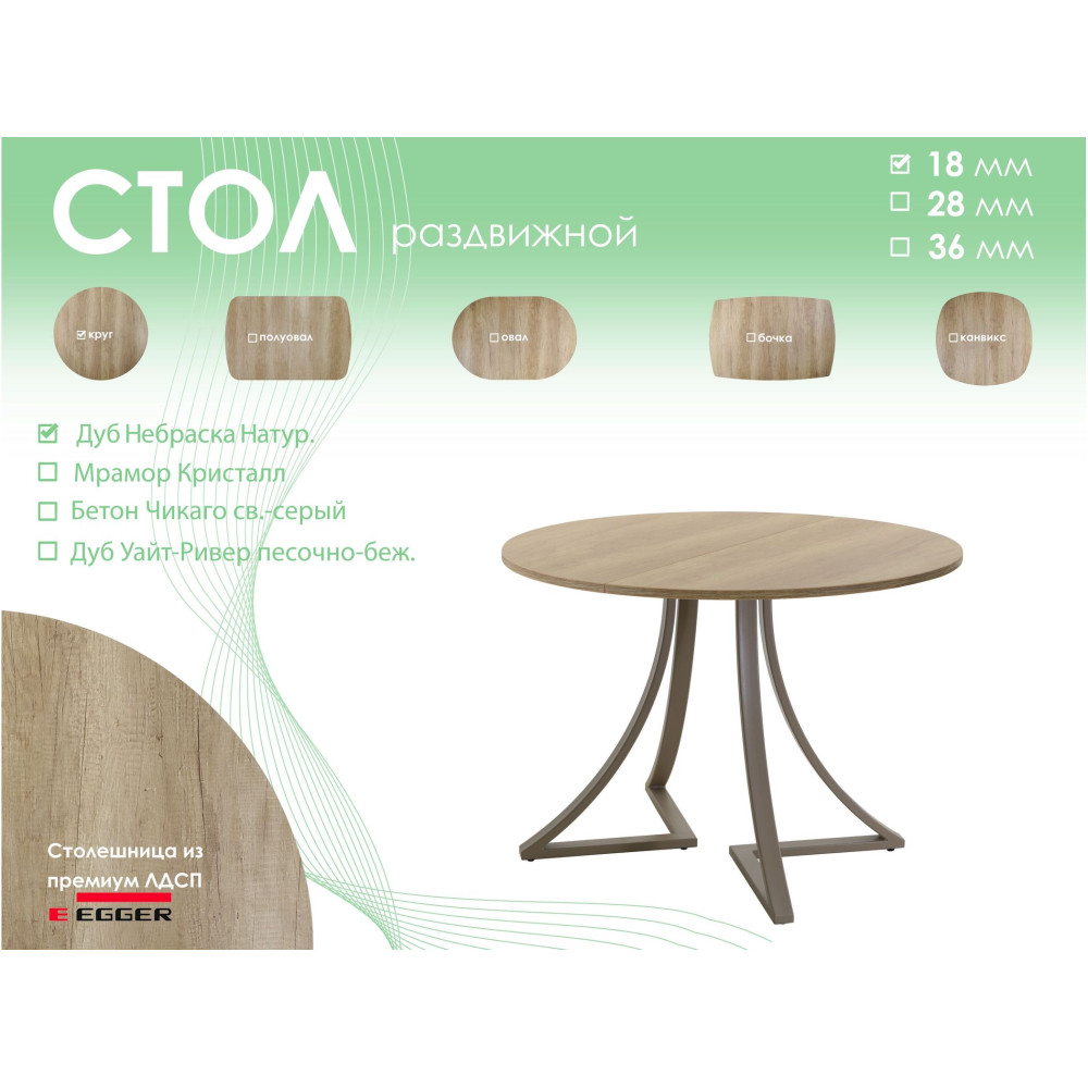 Тип столаобеденный стол | Форма поставкив разобранном виде | Форма столешницыкруг |