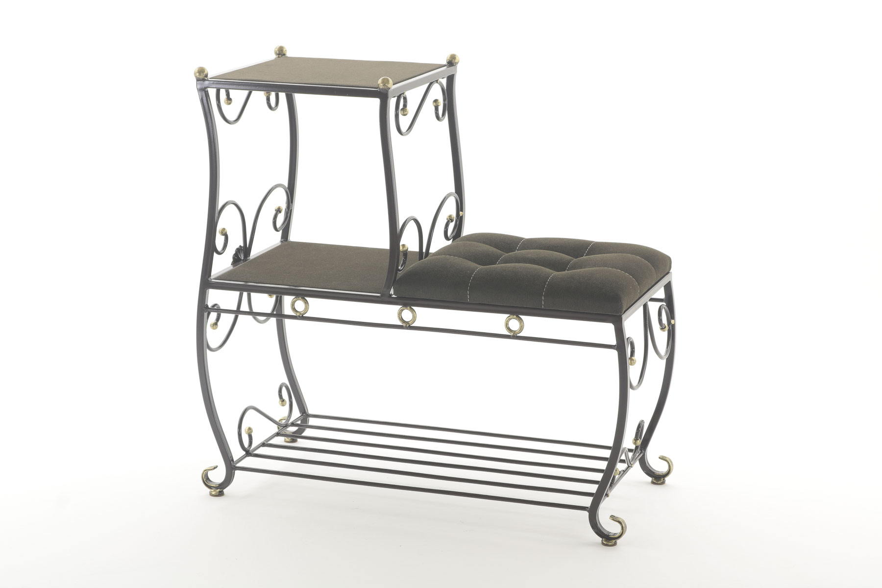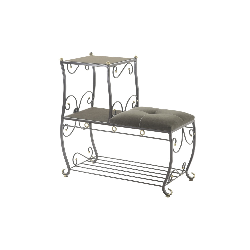 Этажерка представляет собой прочный металлический каркас с мягким сидением из ткани (велюр), а также полочками с открытым доступом к мелким нужным вещам, которые всегда будут под рукой. Кроме того, этажерка комплектуется дополнительной полкой, что мгновенно решит проблему разбросанной обуви. строчка пуфика выполнена высокопрочной полиэфирной нитью, что придает изделию не только красоту, но и надежность, поскольку данная нить устойчива к истиранию и обладает отличной светостойкостью.
