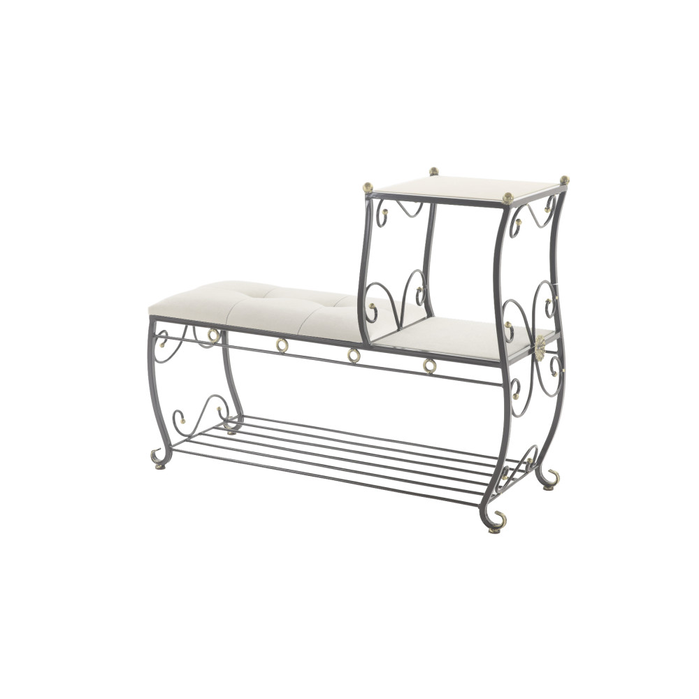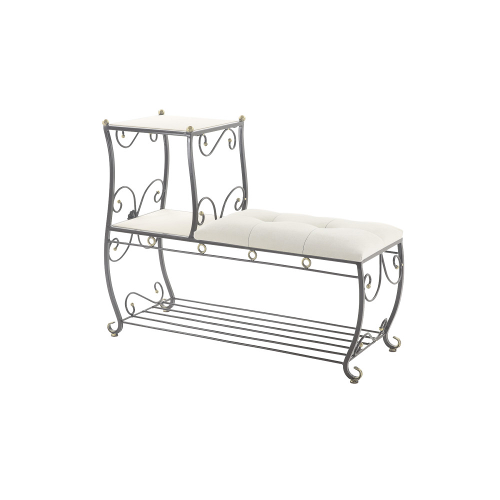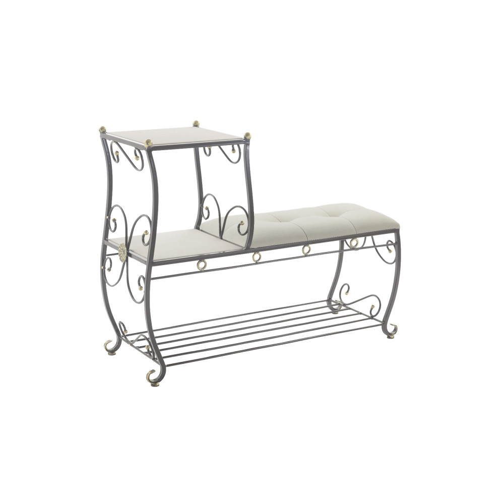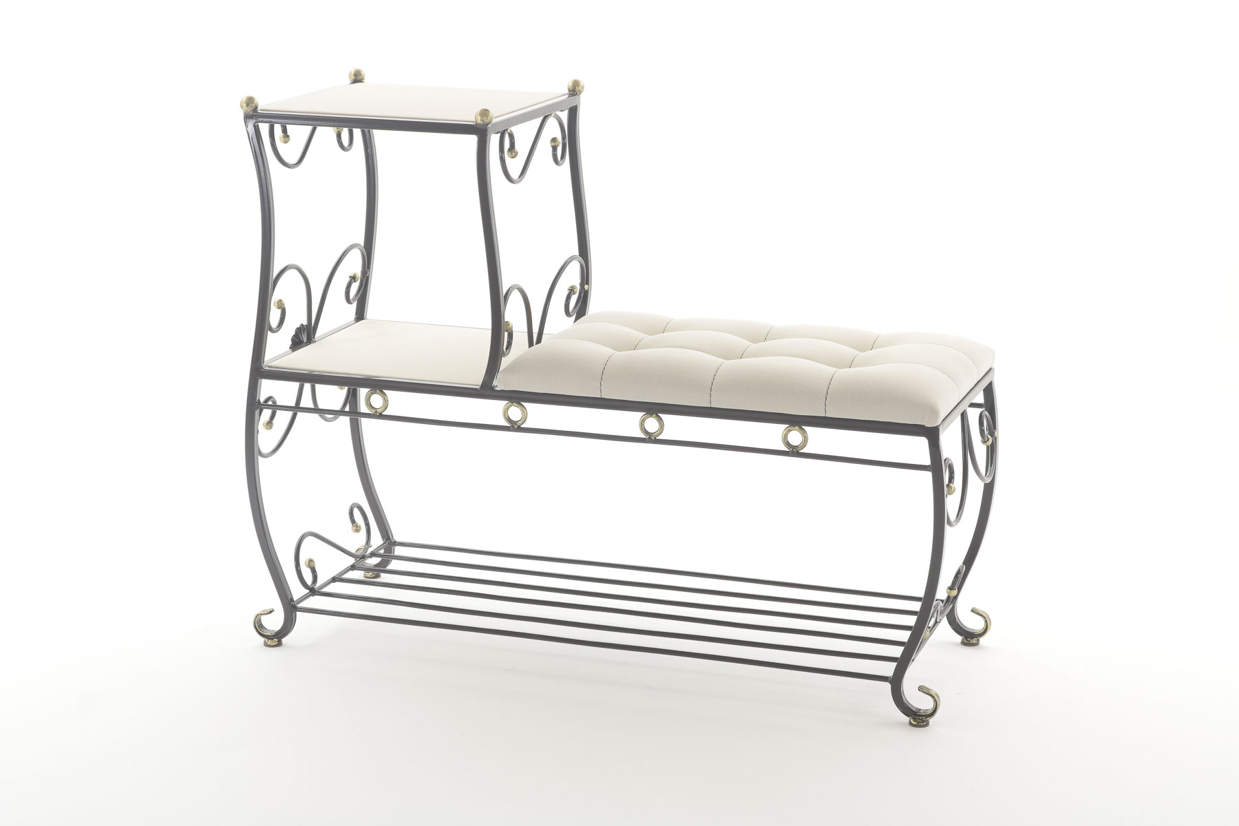 Этажерка представляет собой прочный металлический каркас с мягким сидением из ткани (велюр), а также полочками с открытым доступом к мелким нужным вещам, которые всегда будут под рукой. Кроме того, этажерка комплектуется дополнительной полкой, что мгновенно решит проблему разбросанной обуви. строчка пуфика выполнена высокопрочной полиэфирной нитью, что придает изделию не только красоту, но и надежность, поскольку данная нить устойчива к истиранию и обладает отличной светостойкостью.