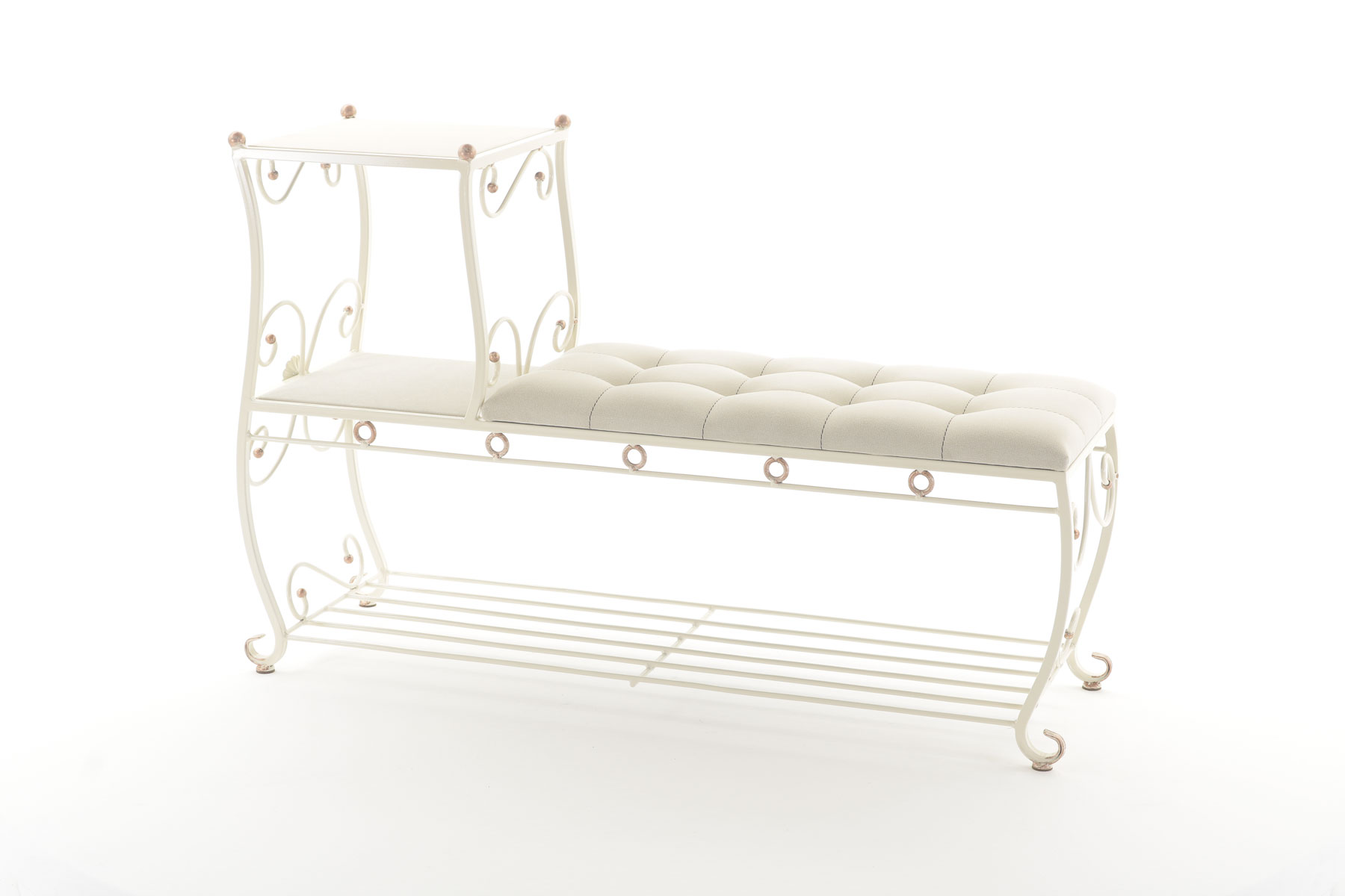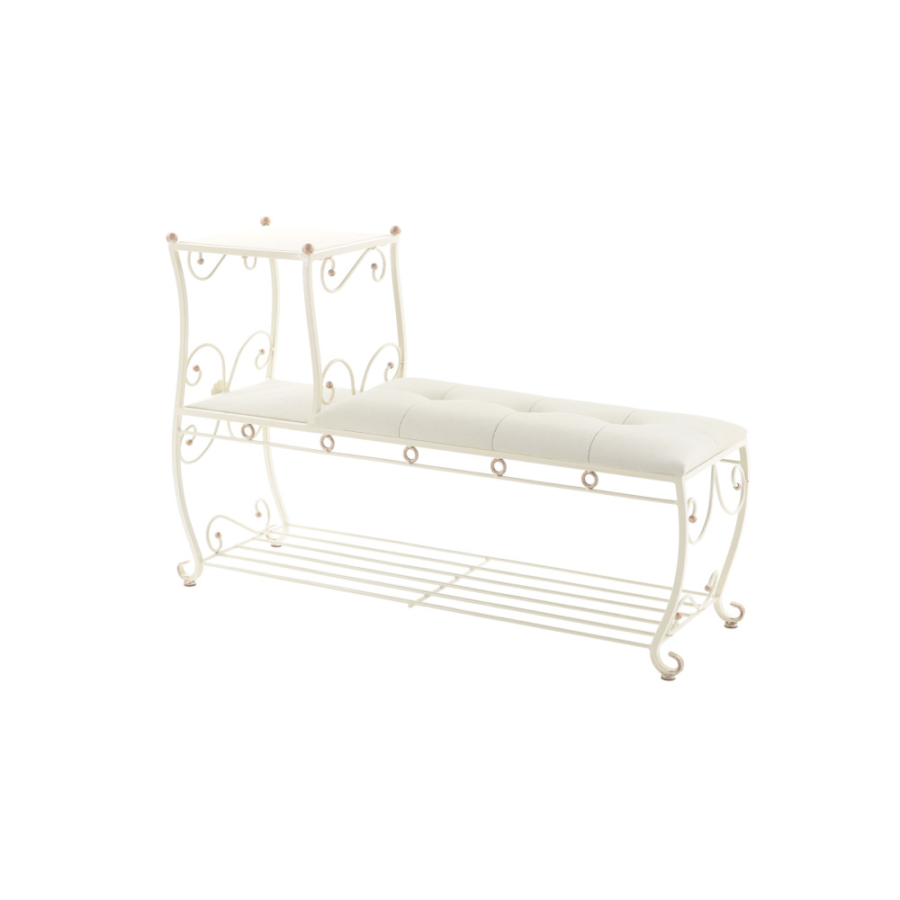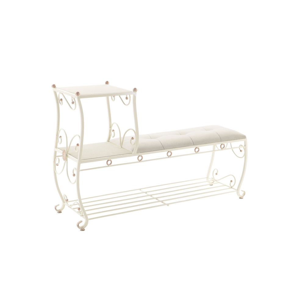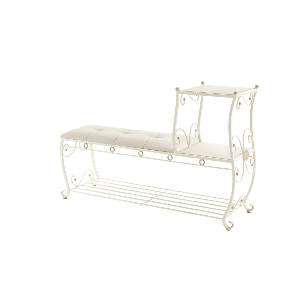 Этажерка представляет собой прочный металлический каркас с мягким сидением из ткани (велюр), а также полочками с открытым доступом к мелким нужным вещам, которые всегда будут под рукой. Кроме того, этажерка комплектуется дополнительной полкой, что мгновенно решит проблему разбросанной обуви. строчка пуфика выполнена высокопрочной полиэфирной нитью, что придает изделию не только красоту, но и надежность, поскольку данная нить устойчива к истиранию и обладает отличной светостойкостью.