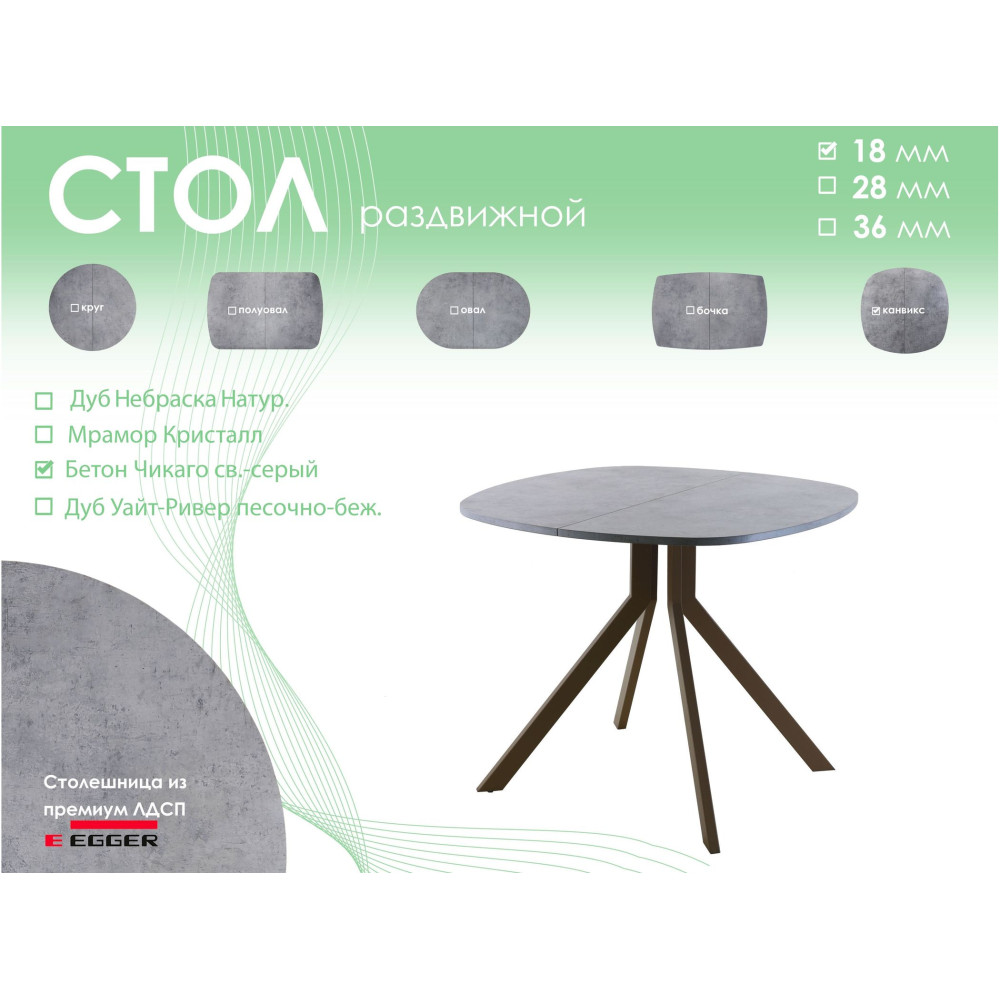 | Тип столаобеденный стол | Форма поставкив разобранном виде | Форма столешницыканвикс |