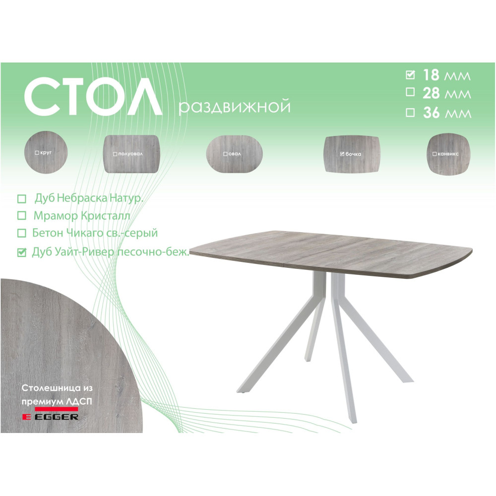 Тип столаобеденный стол | Форма поставкив разобранном виде | Форма столешницыбочка |