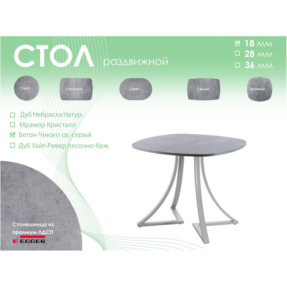 Тип столаобеденный стол | Форма поставкив разобранном виде | Форма столешницыканвикс |